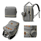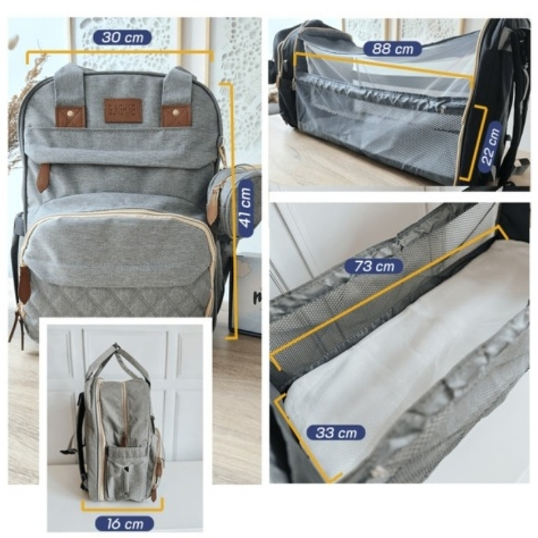 También posee: bolsillos térmicos, puerto USB, ganchos para el cochecito, bolsillo para toallitas, bolsillo impermeable, alcochado y tela de sombra con mosquitero para la cuna.